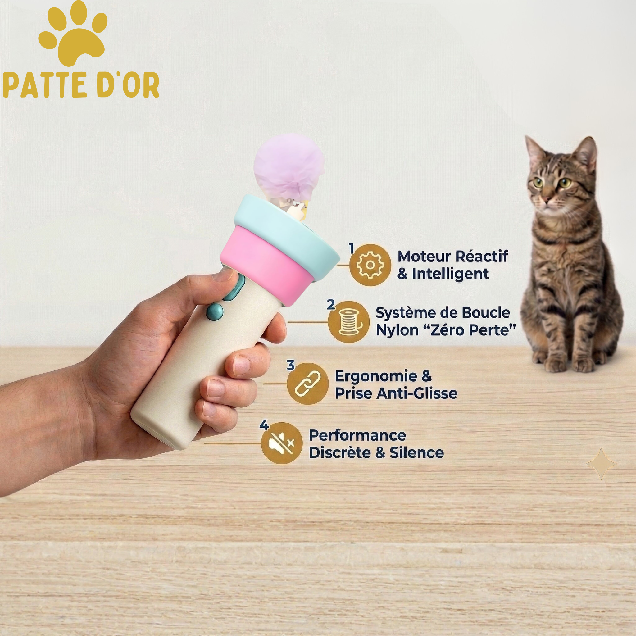Ne passez plus votre temps à ramper sous les meubles pour récupérer les jouets de votre chat. L'Interactif™ Patte D'Or révolutionne vos moments de complicité grâce à sa technologie de projection en boucle. En tenant l'appareil, vous créez une cible mouvante et imprévisible qui captive instantanément l'instinct de votre félin.