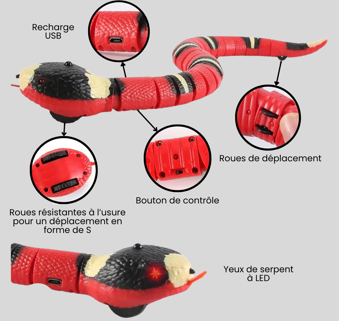 Le serpent est équipé de capteurs infrarouges qui détectent les obstacles et les mouvements. Lorsqu'il est allumé, il se déplace automatiquement en ondulant, imitant les mouvements d'un vrai serpent. Il s'arrête après environ 1 minute d'inactivité et redémarre lorsqu'il détecte un mouvement ou un toucher.